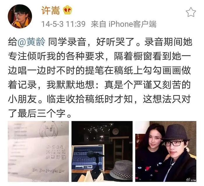 他俩就是从这首歌开始又了交集,然后绯闻也是从那时传出来的。许嵩在微博晒合照,黄龄在纸上手写他的名字,可可爱爱,又是被过期糖甜到的一天。