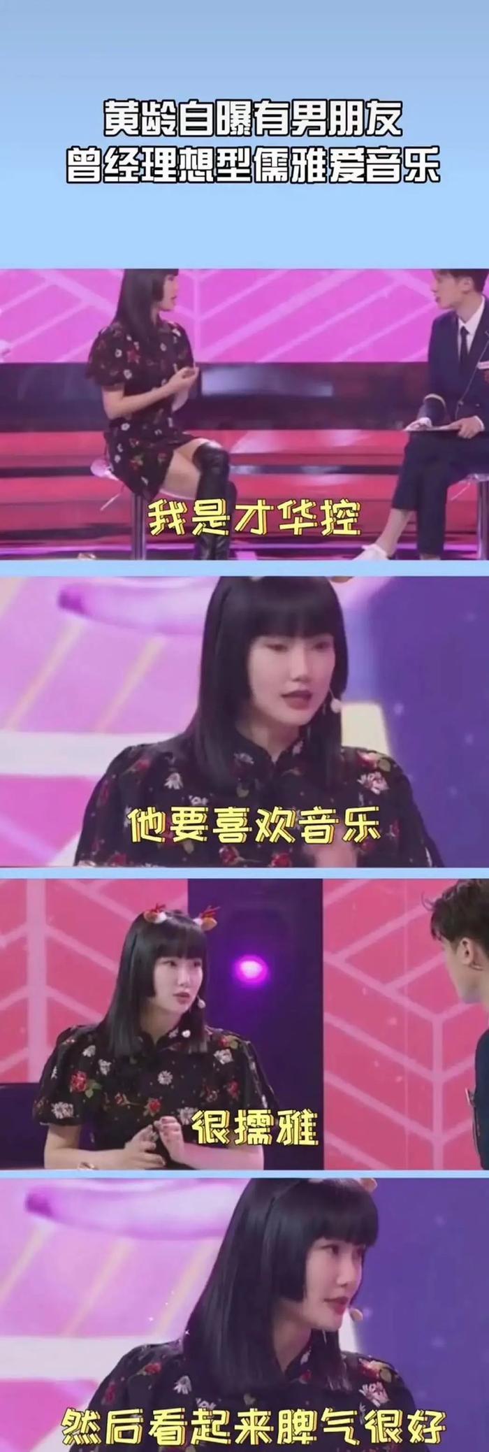 黄龄之前在节目里提到自己的理想型,才华控,喜欢音乐,很儒雅,看起来脾气很好,声音又好听。