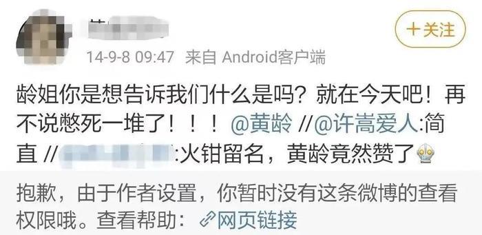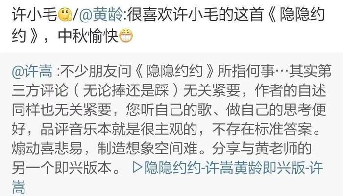 不知道他俩搞真的还是只是为了配合宣传,9月份两人又合唱了《隐隐约约》,黄龄点赞了一条祝福她和许嵩在一起的微博,差点把不少许嵩粉丝直接送走,连夜跑路。
