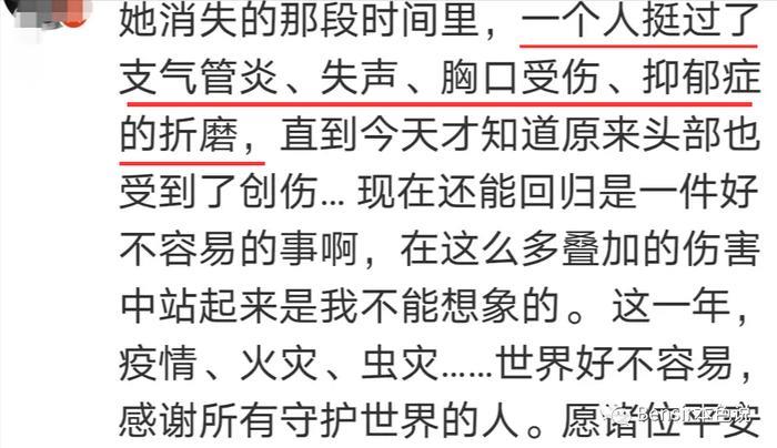 粉丝说,她消失的那段时间里,熬过了支气管炎、失声、胸口受伤、抑郁症的折磨…