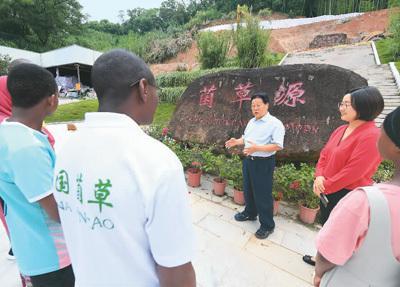 福建农林大学国家菌草工程技术研究中心首席科学家林占熺(右三)为来自非洲的留学生讲授菌草生态治理技术。 新华社记者 林善传摄