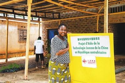 在中非共和国首都班吉郊区,中国援中非菌草技术项目的众多受益者之一法蒂玛站在该项目展板旁。 新华社记者 罗 毓摄