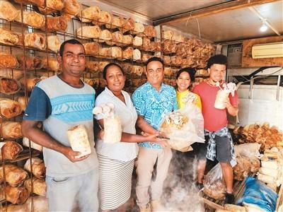 在斐济第三大城市楠迪,一家蘑菇公司员工展示在中国援斐菌草技术示范中心项目帮助下种植的蘑菇。 新华社记者 张永兴摄