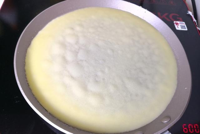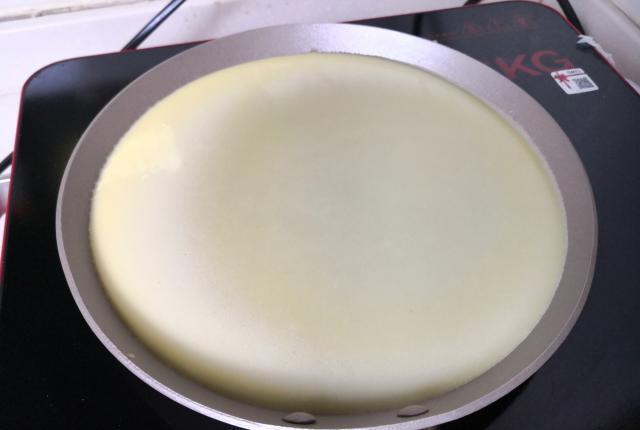 4、 【千层锅的温度控制要求】煎制千层皮时,锅底要保持一定的温度,但是不要过烫。过烫,面糊容易一下子就凝固了,来不及将所有面糊均匀摊开;如果锅底温度不够,则不能有效的摊开,流动性太强,不容易挂住。所以适宜的锅温很重要,大家可以多煎几张皮摸索一下,后面就能慢慢发现规律,得心应手了。实践出真知,相信伙伴们能很快get到技巧的~