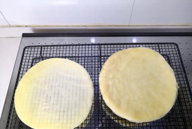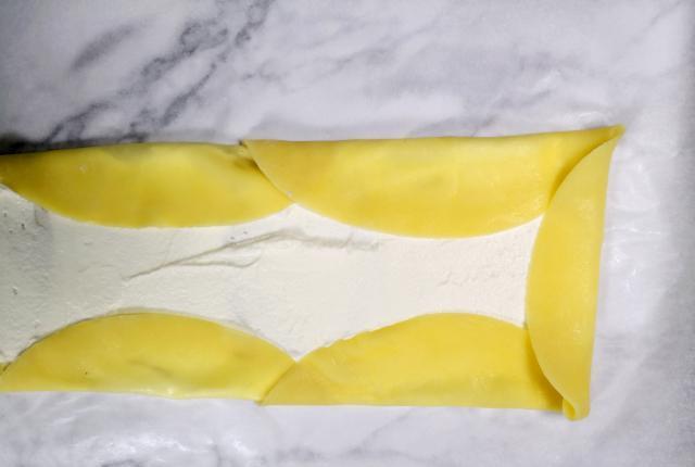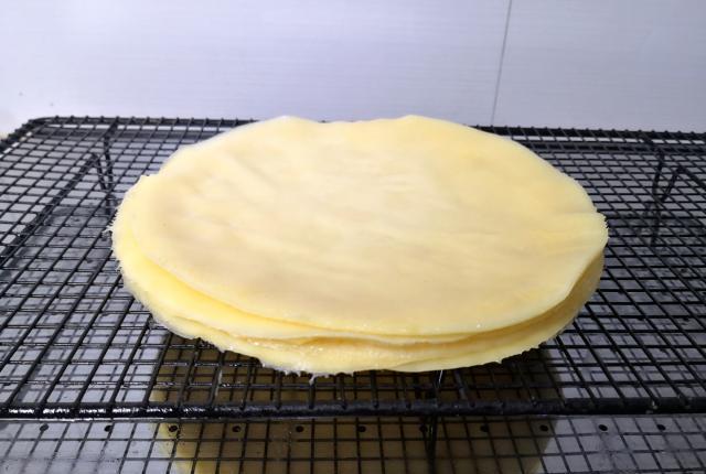 13、 将千层皮铺在油纸上,每一张之间有一定的交界。