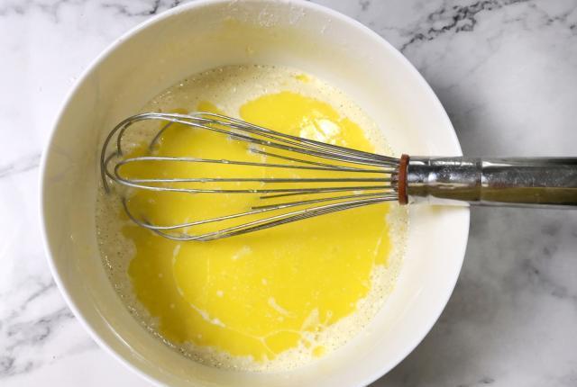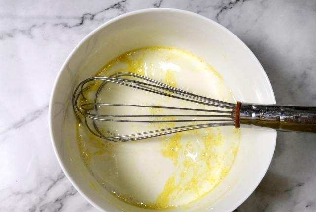3、 加入融化的黄油拌匀至无油点,充分乳化。