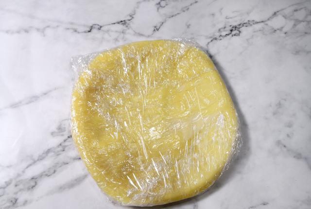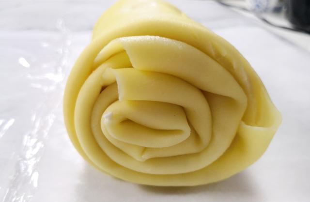 11、将千层皮整理排列好,用保鲜膜裹好,放入冰箱冷藏1小时,使之完全冷却,同时也可以让其表面的油被饼皮吸入,更方便后续操作。
