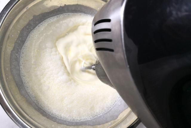 【夹馅和组装】12、淡奶油中,一次性加入糖,以中速打发至纹路不消失的状态。