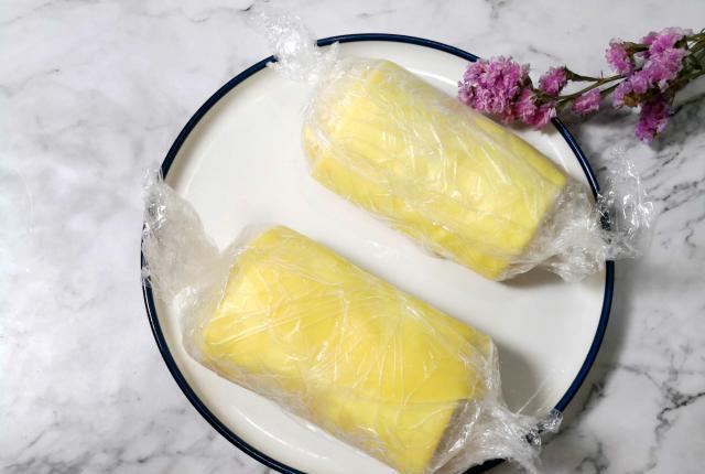 16、 用油纸辅助将毛巾卷卷起,再用保鲜膜将其包裹好。