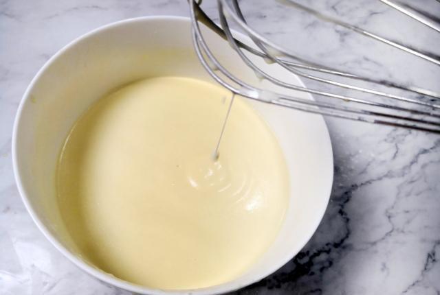 4、 用筛网过滤液体,最后面糊呈线状顺畅流下,则为千层面糊合适的状态。