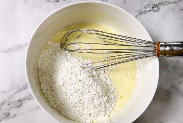 2、 加入低筋面粉,用蛋抽不规则拌匀至无干粉状态,不要画圈搅拌。