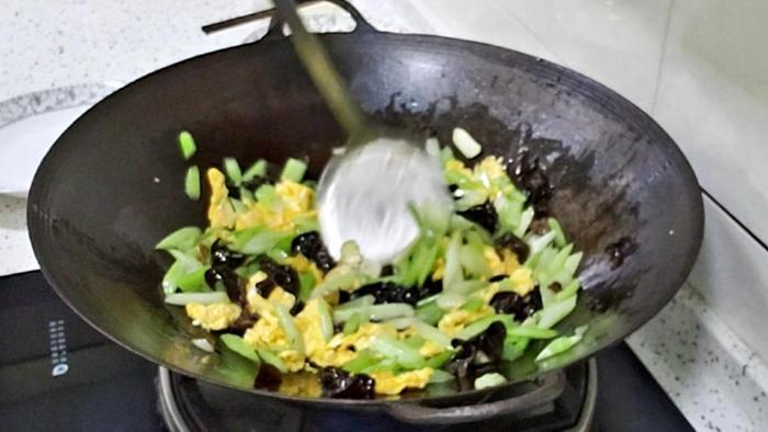 芹菜、木耳炒鸡蛋烹饪中