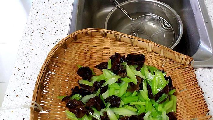 冷水浸泡后控水中的芹菜、木耳
