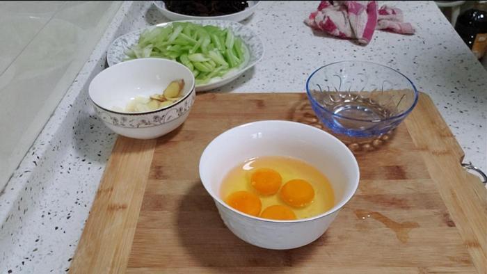 芹菜木耳炒鸡蛋半成品:鸡蛋液、芹菜段、木耳片、姜蒜片