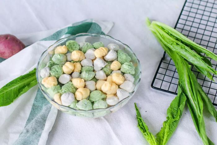 5、油麦菜丸子:油麦菜汁、5克淀粉加入,搅匀;