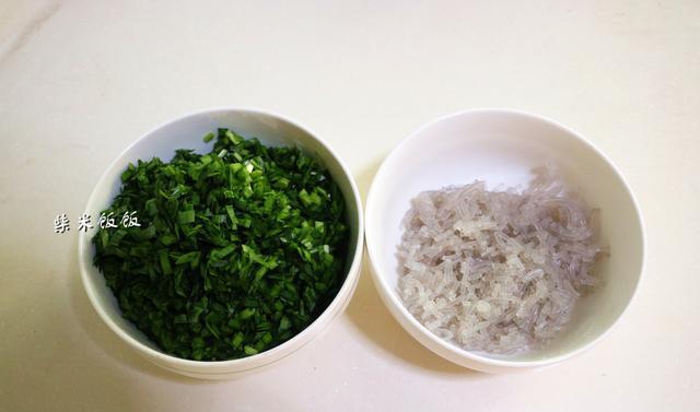 4,韭菜提前洗净,沥干水分后切碎。粉条提前泡发,也切碎。