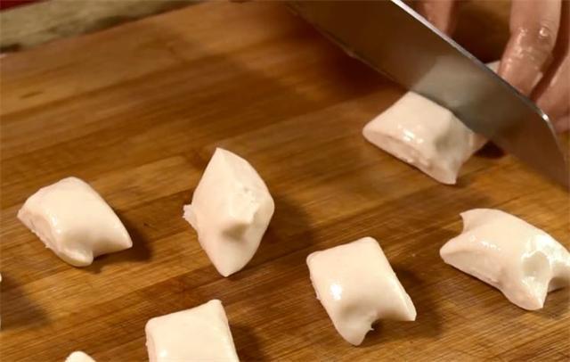 8.面团揉好后搓成长条,再用刀将长条分成大小相同的一个个小面剂子,在这里剂子稍微大点或者小点都没有关系的。