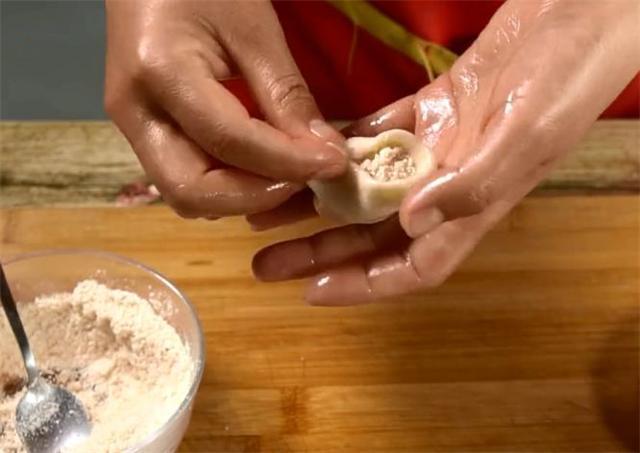 9.接下来我们开始包糖糕,先在手上蘸点油,取一个小面剂子,放在手心里,两手压扁,一只手举起来,手心成一个小坑坑,另外一只手将面团周边均匀压薄,然后再加入一勺馅料,像包包子一样捏褶,最后收一下口,就在两手间进行拍打、压扁,这样能够使面更均匀,这个时候我们的糖糕就包好了。