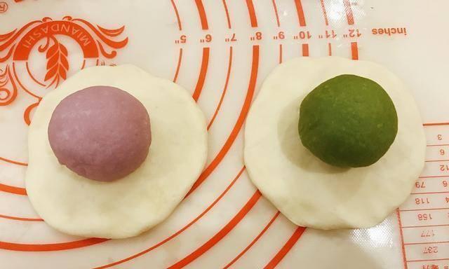 11、现在需要用到准备好的原味面团,然后用手进行按扁,然后将上面准备好的彩色面团给包进去,这样才能进行下一步。