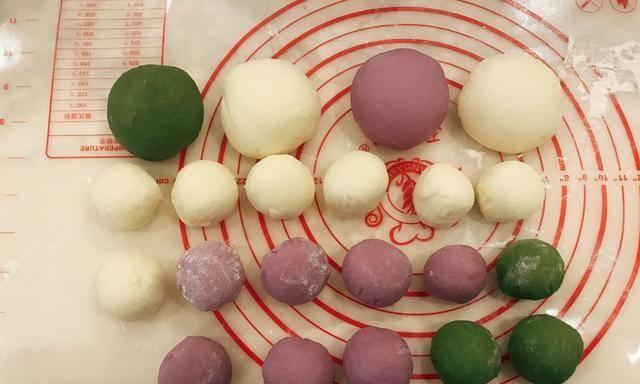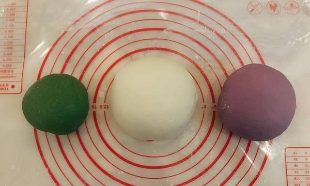2、将准备好的三种粉进行加工,具体的步骤没有特别复杂,就是用手将三种粉进行分别搓,一直把准备好的三种粉从粗糙的粉团揉成表面光滑的面团,这时候不要直接进行蒸,需要将准备好的面团放在面盆或者面板上,直到面团分别发酵变大至原来的两倍即可。