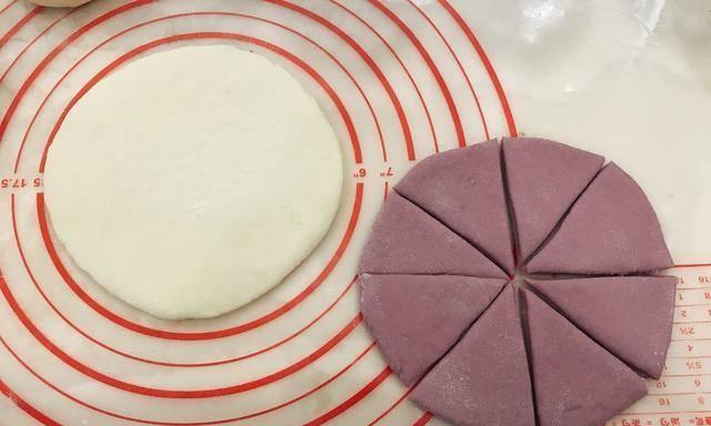 4、将揉好的两种颜色的面团分别分成大小相同的面团,然后用工具将面团制成圆饼状的面团,厚度均匀在1cm即可,现在需要将准备好的工具拿出来用了,目的是为了将其分成大小均匀的八块即可,放在一旁备用。