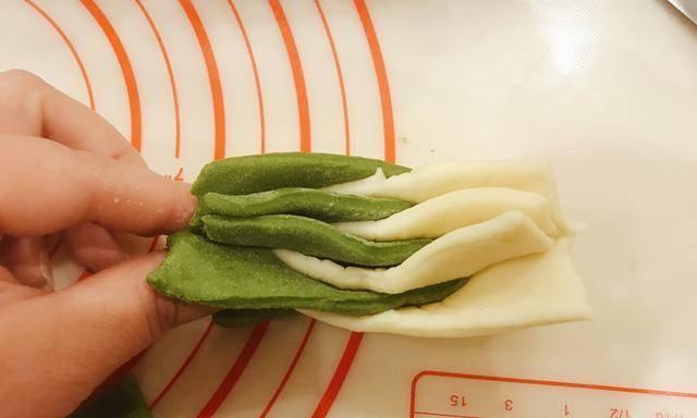 5、两种不同颜色的面饼准备好了之后需要进行再次加工,那就是将两种面饼进行交替然后分别叠放在一起,具体可以参照上图进行操作。