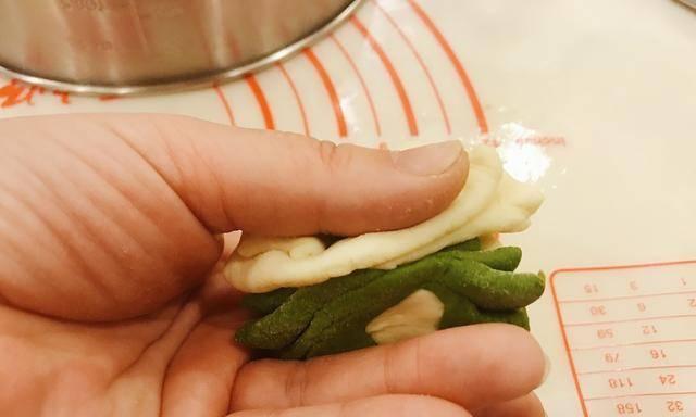 13、将面团揉成1cm的长条状,不同颜色的旋转为麻花状,这时候需要再盘成棒棒糖的形状,现在馒头做好了,就可以进行蒸了,方法很简单就是将准备好的馒头放入笼屉中,然后放入已经烧开的锅中进行大火蒸十五分钟,时间到了之后将火关掉,锅中焖5分钟后掀锅起锅即可。