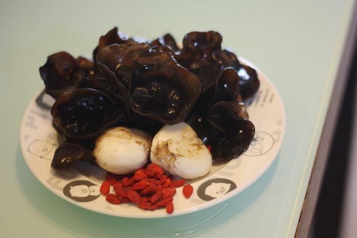 黑木耳200克,鲜百合100克,枸杞20克,姜5克,蒜15克,食盐3克,玉米淀粉5克