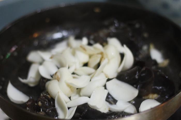 一小段时间以后,打开锅盖,然后把处理好的百合,也倒进装有黑木耳的锅里面,接着继续用铲子进行爆炒,记得一定要爆炒,因为这样可以很好的保持百合的色泽,爽脆以及口感等方面。