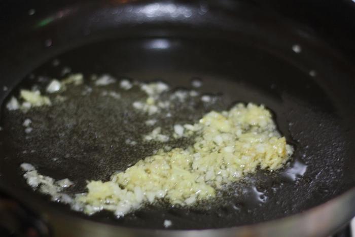冷锅开火烧热,油热以后,将切好的蒜蓉和生姜末倒在锅里面,用铲子不断地翻炒,进行爆香。