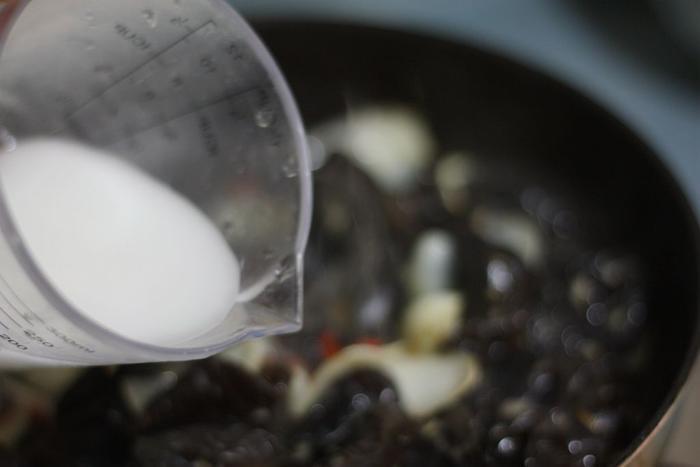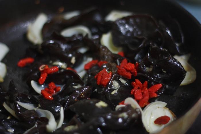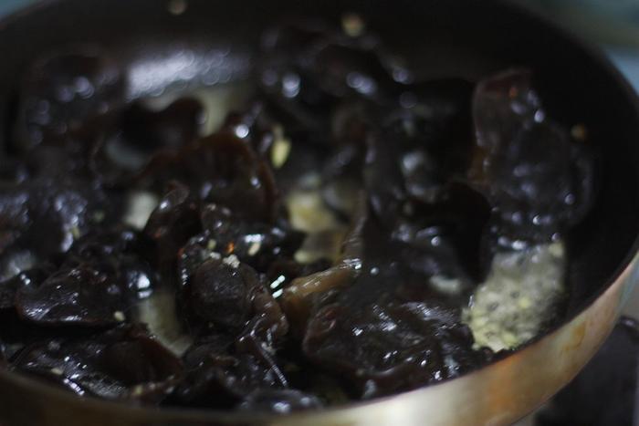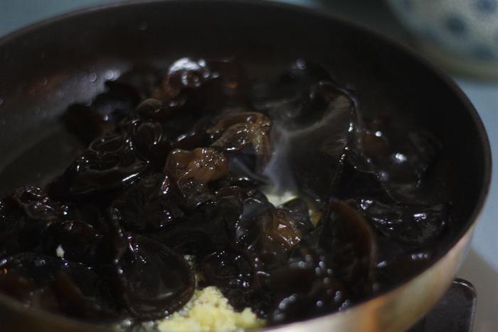 散发出香味以后,将已经处理好的黑木耳倒进锅内,用铲子继续翻炒一段时间。