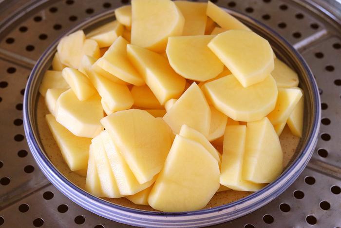 把我们需要的食材和配料都准备好,首先把土豆去皮冲洗干净,放在案板上用刀切片,再将其放入蒸锅中,蒸上10分钟。(蒸土豆的时间以土豆熟透为基准。蒸土豆的时候,我们可以把蒸锅下面放上一碗热水,这样可以防止土豆水分过量的流失)