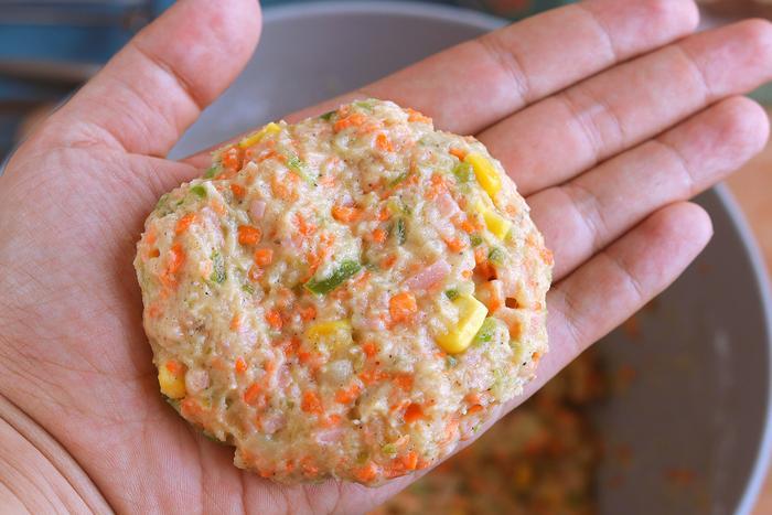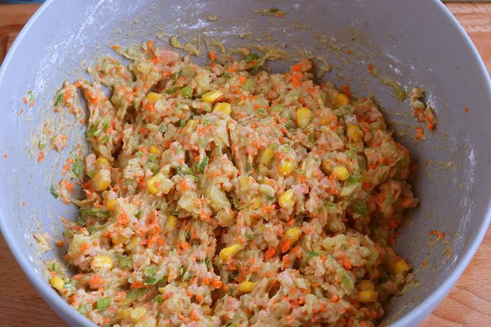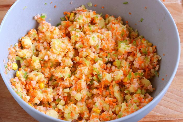 再往小碗中倒入火腿、胡萝卜、玉米粒、青椒末,将它们放在一起均匀地搅拌。