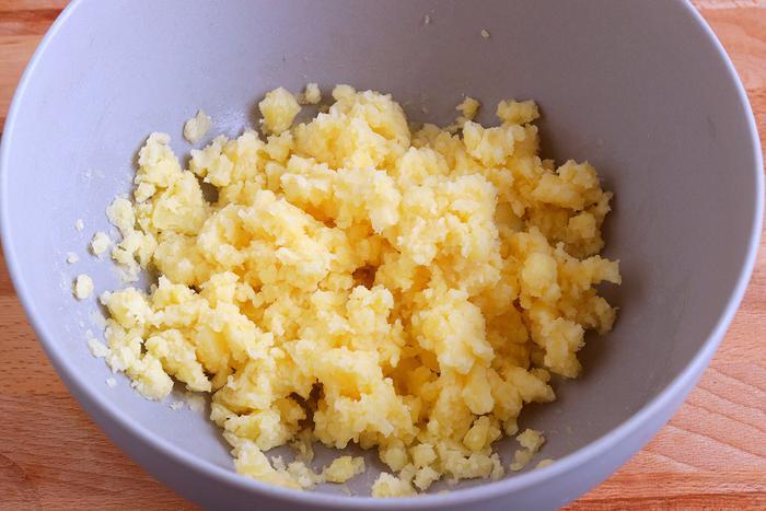 待到土豆蒸好后,我们将其放入碗中,用勺子碾压成土豆泥。(用其他工具也可以,碾压得尽量细腻一点)