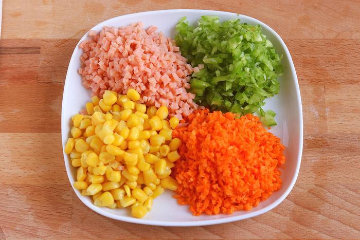 接下来我们把玉米粒准备好,胡萝卜去皮冲洗干净切末、青椒冲洗干净切末、火腿肠扒皮切末。