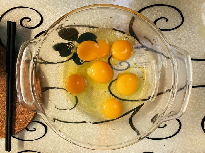 1.取一个足够大的容器,将鸡蛋打在容器内打散;