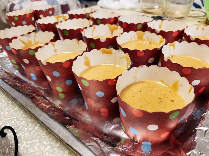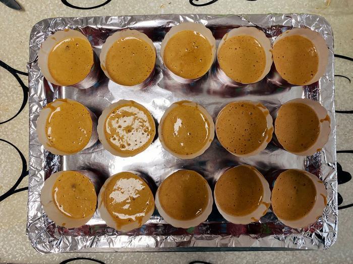 烤蛋糕的模具,我选择的是方便快捷的蛋糕纸杯。蛋糕纸杯内刷油,将枣糕糊倒入纸杯内2/3即可,因为后续烤制过程中会膨胀长大,所以2/3高度即可。