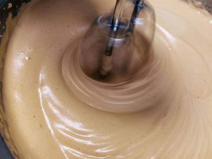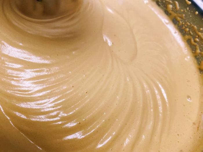 将蛋液与红糖充分打匀后,开始高速打,肉眼可见盆里的枣糕糊体积在不断增多且变得粘稠,直到打出纹路不易消失。