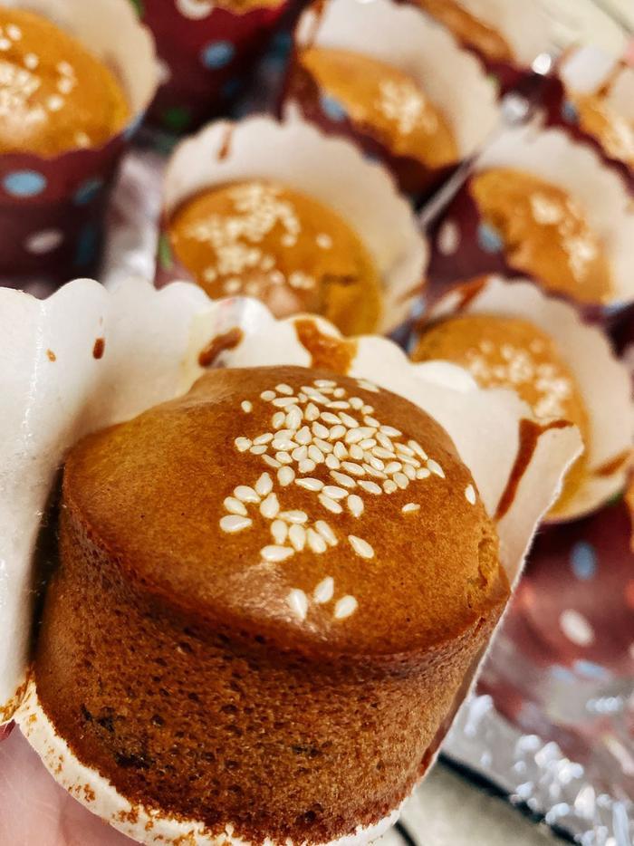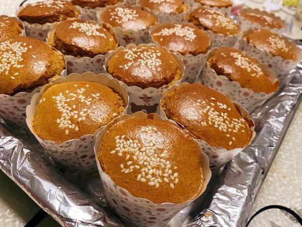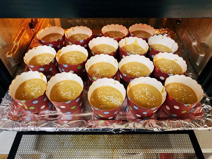 入烤箱之前在枣糕糊表面撒上白芝麻。烤箱上下管150度预热10分钟,把准备好的金丝枣糕糊放入烤箱中层,150度烤制40分钟。