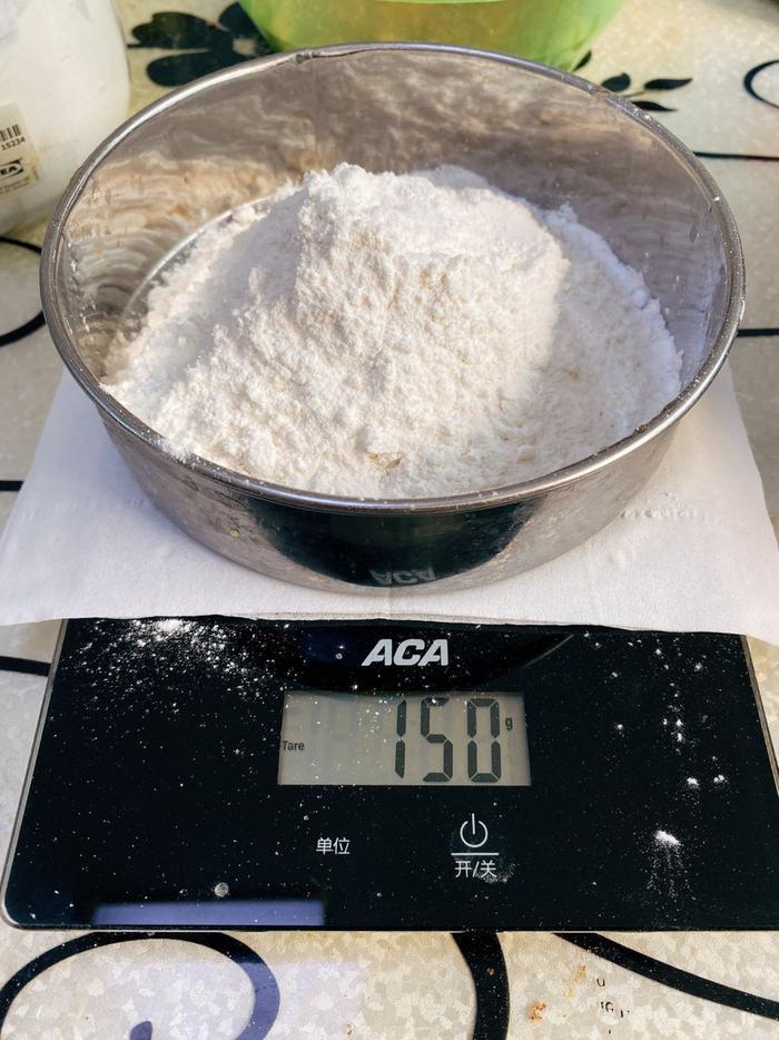 称150g低筋面粉,过筛,倒入打好的鸡蛋红糖中,分别加入3g泡打粉、2g食用小苏打、2g食盐,搅拌均匀。
