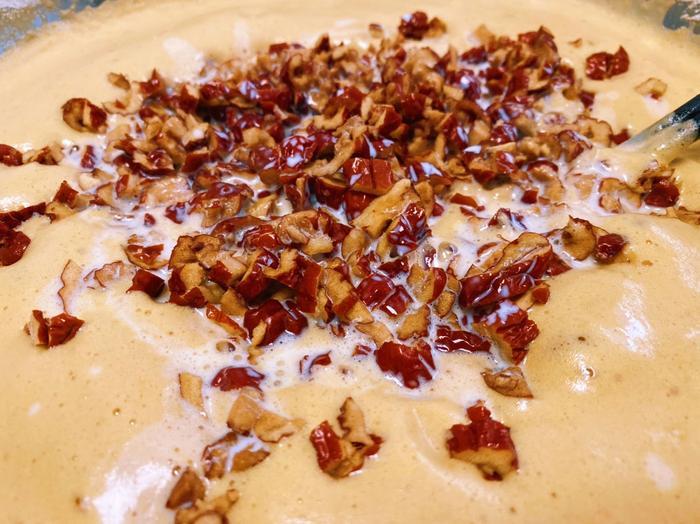 将切好的75g红枣碎、75g纯牛奶加入混合好的枣糕糊中,再次搅拌均匀至无干粉。