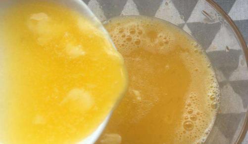 然后我们再准备一些黄油,也要记得把黄油提前融化,等到黄油融化好以后,把准备好的黄油也加入到鸡蛋液里面,再一次充分的搅拌均匀,直到黄油与鸡蛋液充分的融合在一起就可以了。