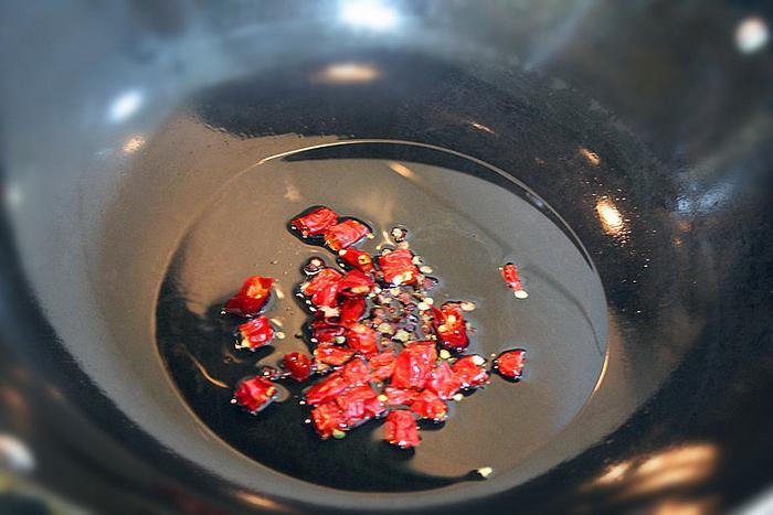 步骤二、起锅,锅中倒入适量食用油,烧到六成热左右时,下入准备好的花椒和干辣椒段,炒出香味。
