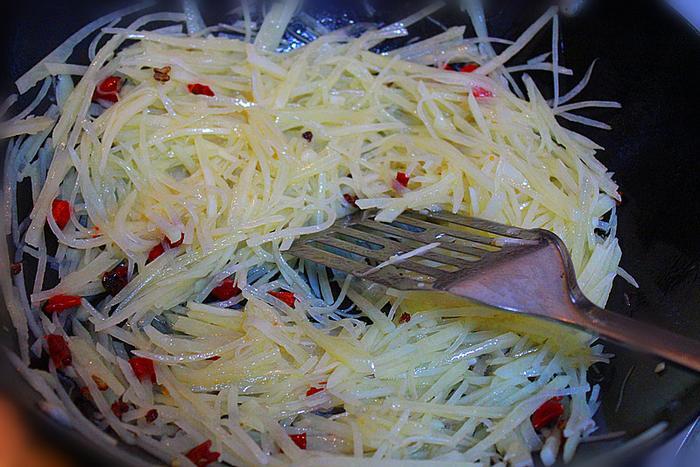 步骤四、将土豆丝全部倒进锅里翻炒均匀。
