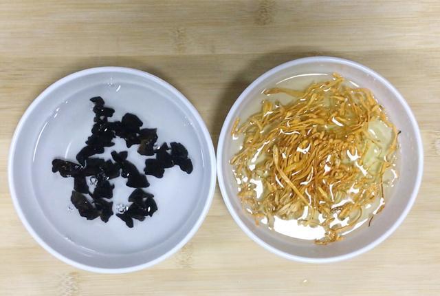 2.把干木耳和干虫草花提前1小时用温水浸泡。(不想麻烦的同学可以直接买新鲜木耳和虫草花)