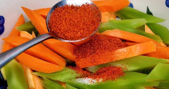 3,准备好一个大土豆去皮后切成小条,一根红薯去皮后切成小条,一根莴笋去皮后切成小条,一根胡萝卜去皮切成小条放入盆中,加入一勺食盐,两勺辣椒粉,三勺食用油,搅拌均匀腌制5分钟入味。