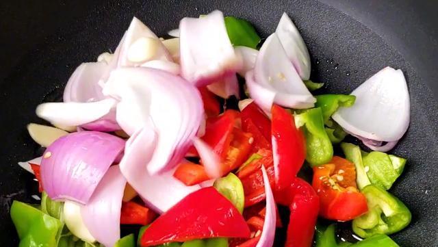 4,准备好一个红青椒切成小块,一个洋葱切块,再准备好半头大蒜去皮,一块生姜切成薄片。准备好一个锅倒入切好的配料,翻炒半分钟。