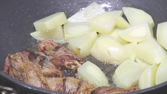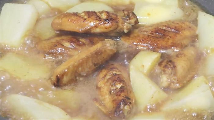 这时候加入腌制好的鸡中翅,我们不能等到土豆煎到变成金黄再下锅,不然后续土豆在炖煮的过程当中就会特别烂,烂就不好吃了。鸡翅下锅之后,继续用中火慢煎,直到把鸡翅煎到两面金黄。这个时候土豆也会一起变得金黄,用之前腌制鸡翅的碗加半碗的清水,把剩下的料汁和水一起倒进锅里就行了。