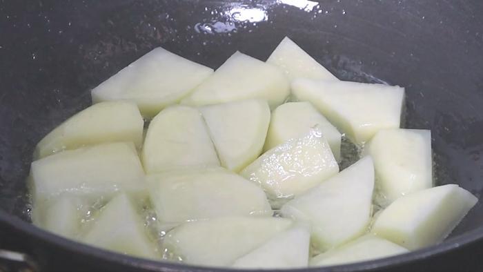 准备一个土豆切成两半,再切成长条,接着在中间的位置,把土豆切成两段,放碗里备用。起锅加入食用油,等油温升高之后,把切好的土豆块放进锅里,慢慢煎。土豆当中含有丰富的淀粉,平时我们不想吃米饭或者其他主食的话,就可以用土豆来代替主食。熟透的土豆口感软糯,而且味道鲜香,日常换换口味,也还是不错的。我们把土豆煎到周围变得微微透明,就说明土豆已经五成熟了,然后就可以把土豆拨在一边。