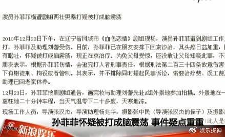 2010年12月23日,网上爆料称孙菲菲在《血色恋情》剧组现场惨遭工作人员暴打,孙菲菲被打成脑震荡。